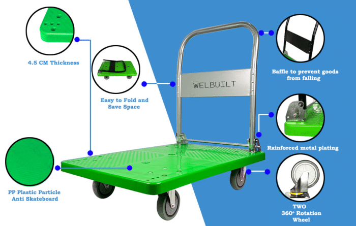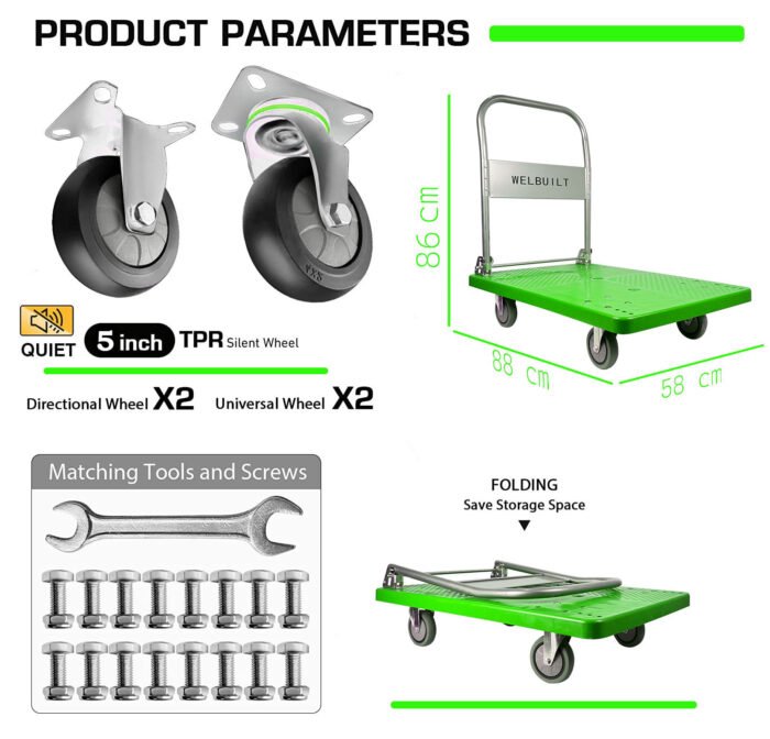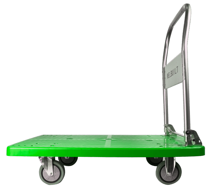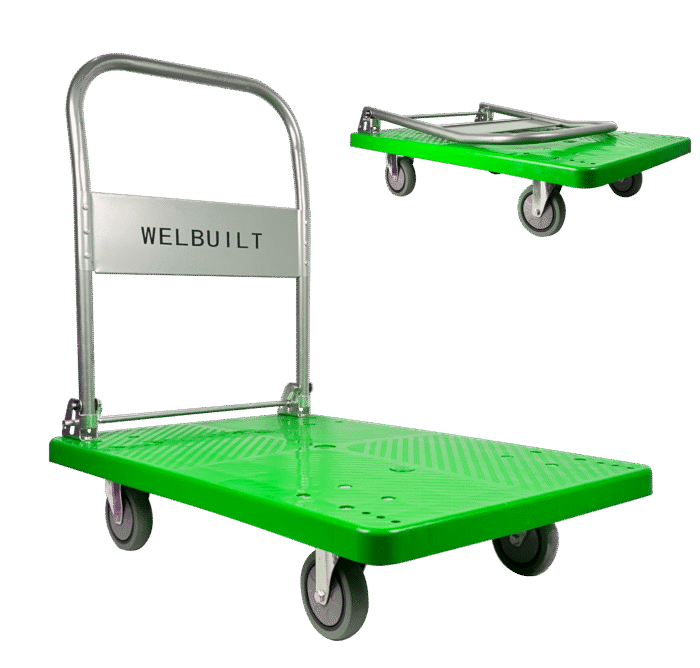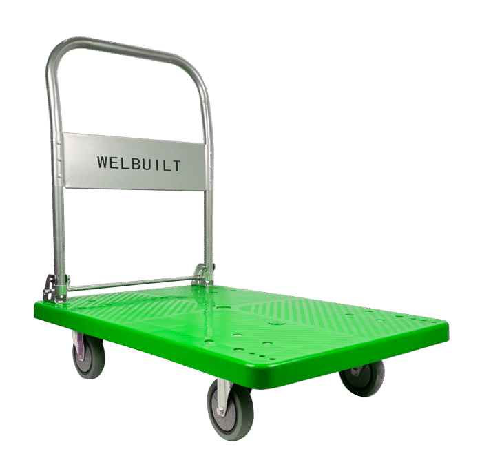The Welbuilt Platform Trolley (300 Kg) – Green Plastic with non-slip platform and 90×60×13 cm dimensions (11.2 Kg) ensures safe, stable, and smooth transport of goods. Its foldable handle and 360° swivel wheels make it ideal for warehouses, offices, and workshops.