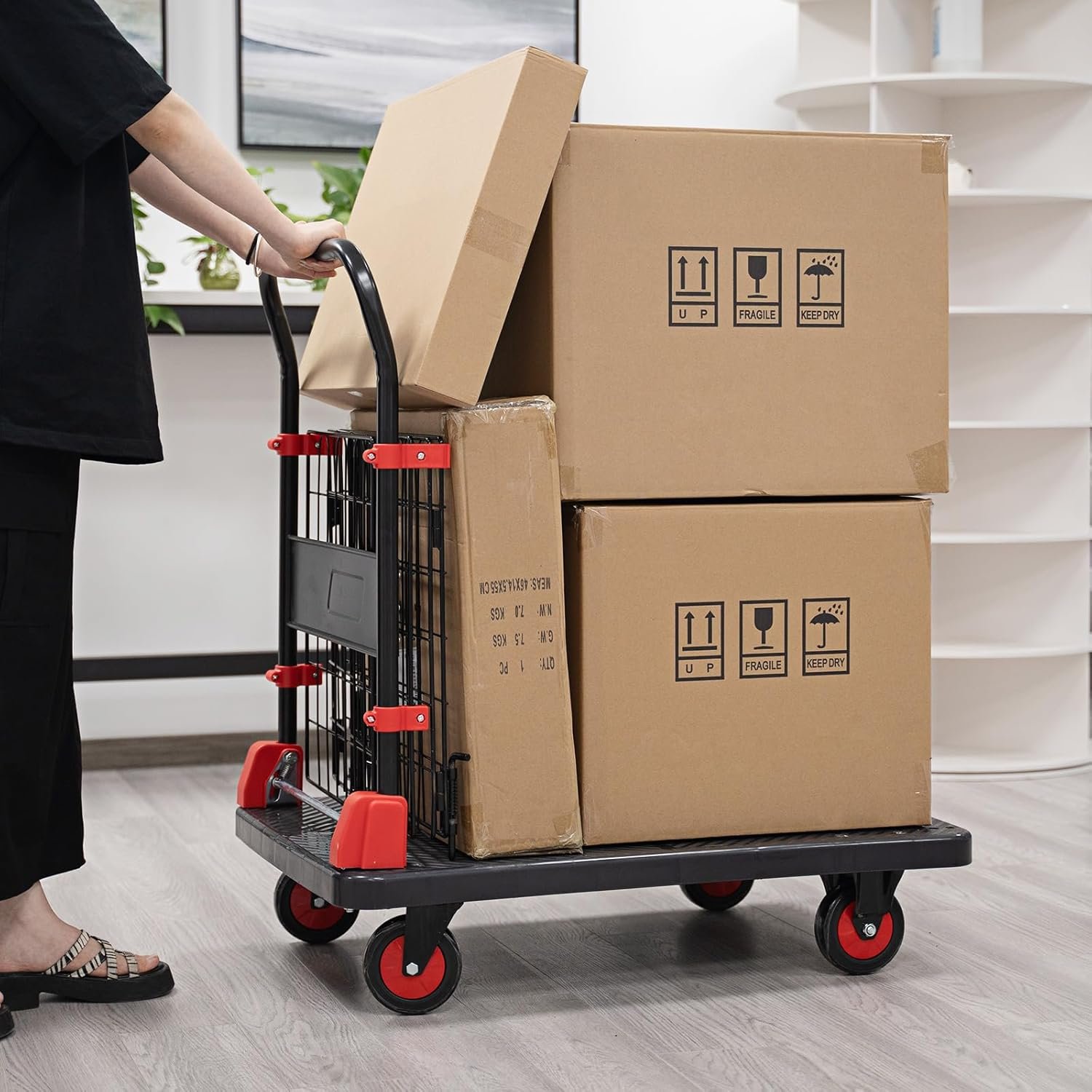 Made with high-quality durable plastic, this trolley features a caged non-slip platform, ensuring that items remain safe and stable during transport.