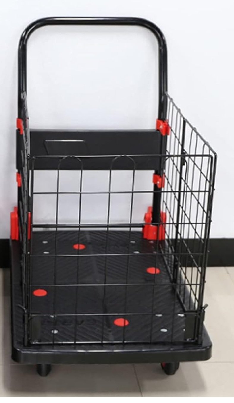 The Welbuilt Platform Trolley (300 Kg) – Black Plastic Cage with caged non-slip platform and 91.44×62.23×19 cm dimensions (15.9 Kg) ensures safe, stable, and smooth transport of goods. Its foldable handle and 360° swivel wheels make it ideal for warehouses, offices, and workshops.